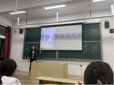 拥有30余年人力资源管理实战经验的董玉辉总监,以“在变化中寻找确定的职业方向”为切入点,结合自身与行业案例,为新生详解HR职业发展逻辑。她首先抛出“VUCA时代”(易变、不确定、复杂、模糊)的行业背景,引用达尔文“最能适应变化的物种才能生存”与马云“输在看不见、看不起、看不懂、来不及”的观点,强调“HR不仅要懂专业,更要懂趋势”。