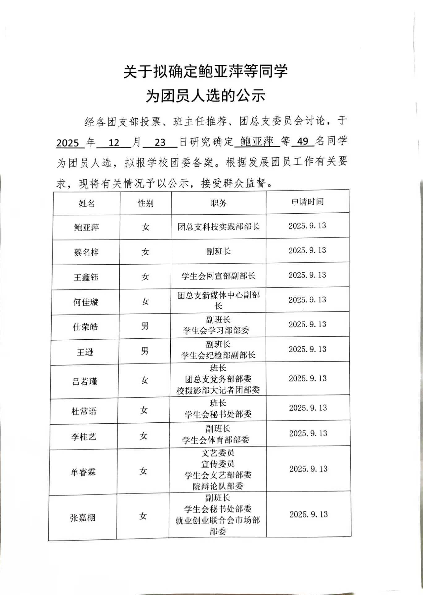 新一批的团员发展对象始终以共青团员标准严格对标自身,锚定思想航向,深学细悟团章团史与党的创新理论,筑牢信仰根基。在实践层面,他们主动投身团组织各项建设工作,积极参与团日活动策划、志愿服务开展等重点任务,以实干担当凝聚青年奋进合力;在成长进程中,充分发挥先锋模范作用,带动身边青年勤学善思、奋勇争先,共同营造积极向上的优良氛围。